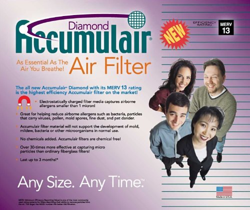 The all new Accumulair Diamond with its MERV 13 rating is the highest efficiency Accumulair filter on the market! Great for helping reduce airborne allergens such as bacteria, particles that carry viruses, pollen, mold spores, fine dust, and pet dander. Accumulair filter material will not support the development of mold, mildew, bacteria or other microorganisms in normal use. No chemicals added. Accumulair filters are chemical free!MERV 13 Rating Great for helping reduce airborne allergens such ...Read More at Amazon.com